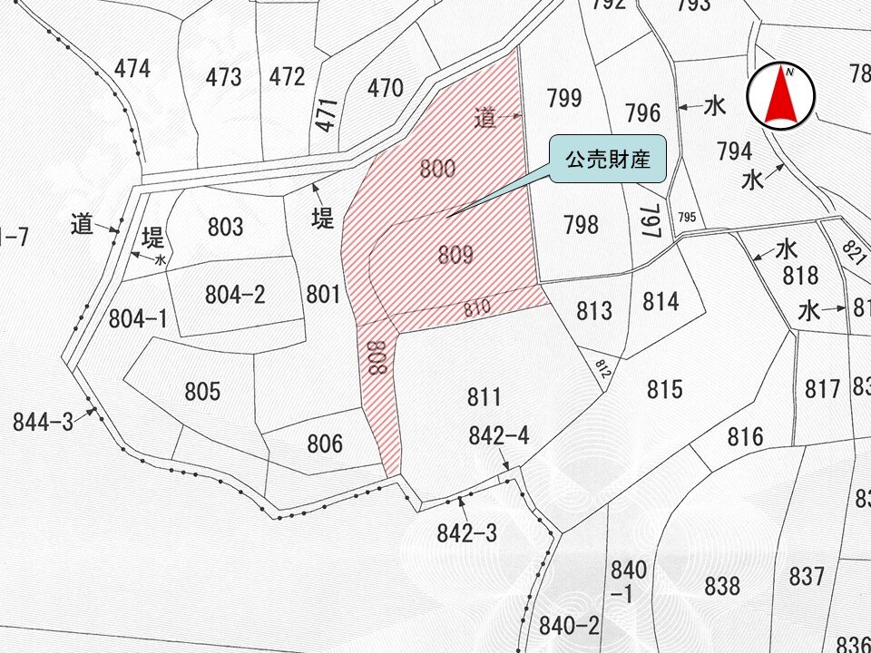 公売財産は、北西側で幅員約2メートルの未舗装 (一部舗装) の里道 (建築基準法上の道路ではない。) に、東側で幅員約1メートルの未舗装の里道 (建築基準法上の道路ではない。) に、それぞれほぼ等高に接面する。