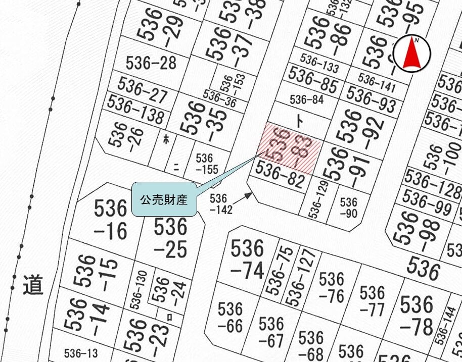 公売財産1は、間口約12.5メートル、奥行き約16メートルの長方形状の画地であり、地勢はほぼ平たんである。