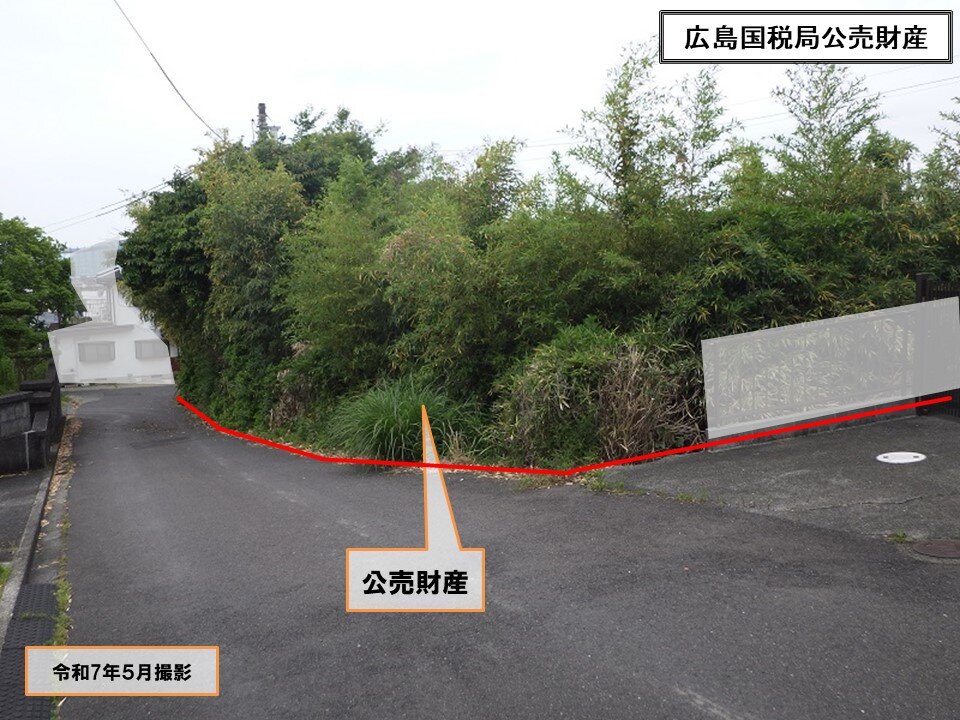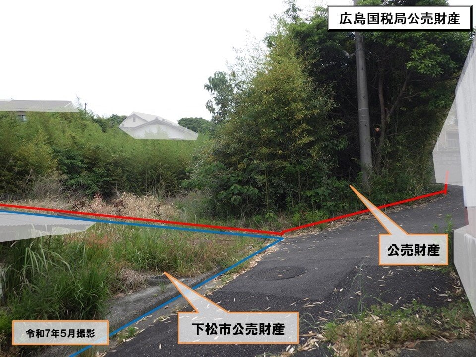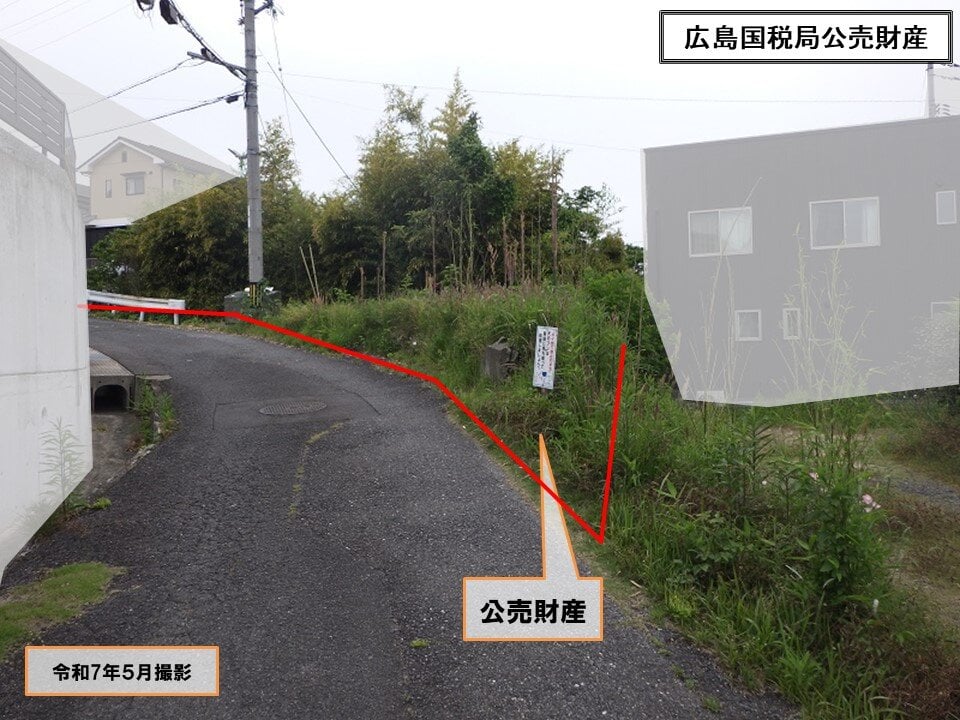 南側は、幅員約4.0メートルの舗装里道に接面している。公売財産の一部を含む里道は、西側から東側にかけての上り傾斜で、接面部分との高低差は、 西側は等高で、東側は里道より約2.0から3.0メートル程度低く接面している。