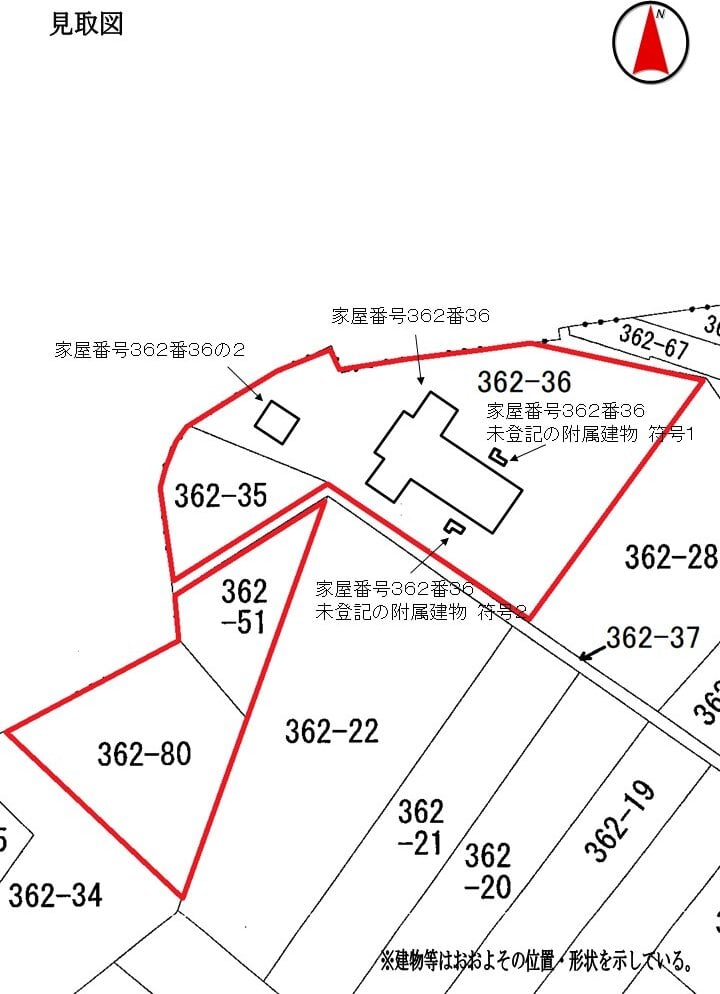 対象物件1と対象物件3との間に公有地 (地番362番37) が介在している。公有地の管理者の申立てによると、払下げが可能な財産として管理されている。