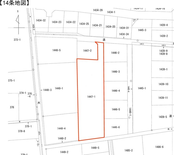 公売財産の前所有者によれば、北辺と隣接地 (地番1447番2) との境界及び西辺と隣接地 (1448番1等) との境界は、それぞれの隣接地所有者との話し合いにより、コンクリート製工作物 (ヒモコン) の手前側 (公売財産側) としたとのことですが、詳細は不明です。