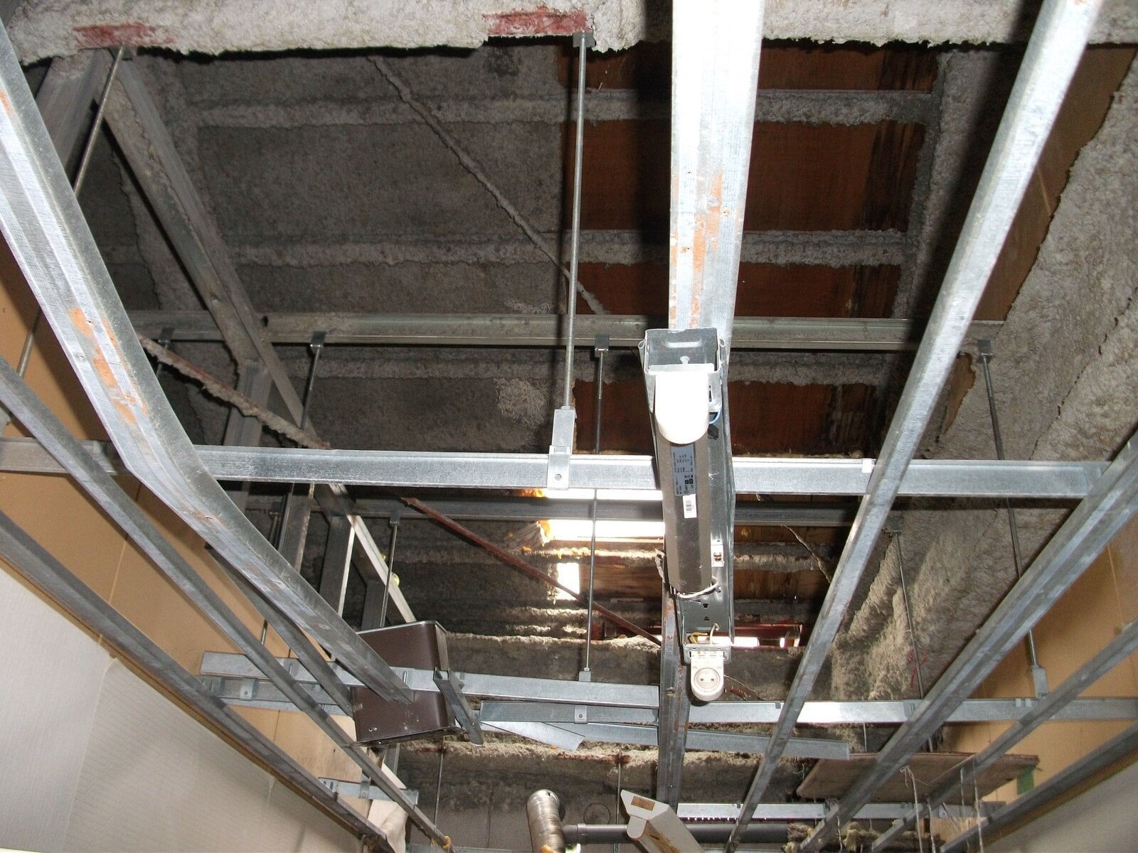 ・天井が剥げ落ちている部分から鉄骨の耐火被覆としてロックウール吹付が確認できる。昭和60年建築のため、石綿が含有している可能性は低いと思われるが、国土交通省の石綿含有データベースによれば、一部建材には含有している。