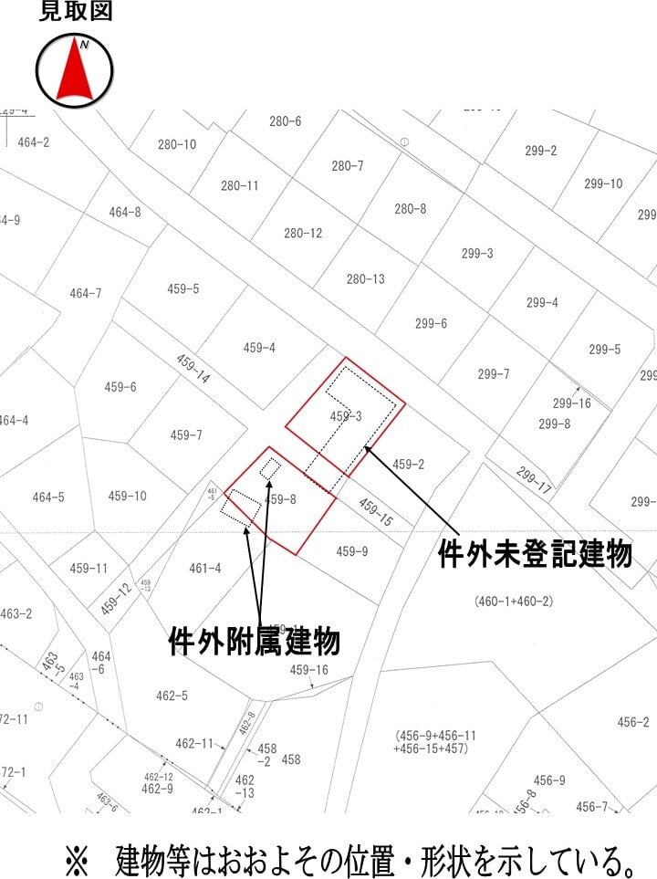 対象物件1の南西側及び対象物件2の北東側 隣接地 (沖縄市宮里三丁目459番14) の一部が件外建物の敷地として使用されている (概測約50m²)。