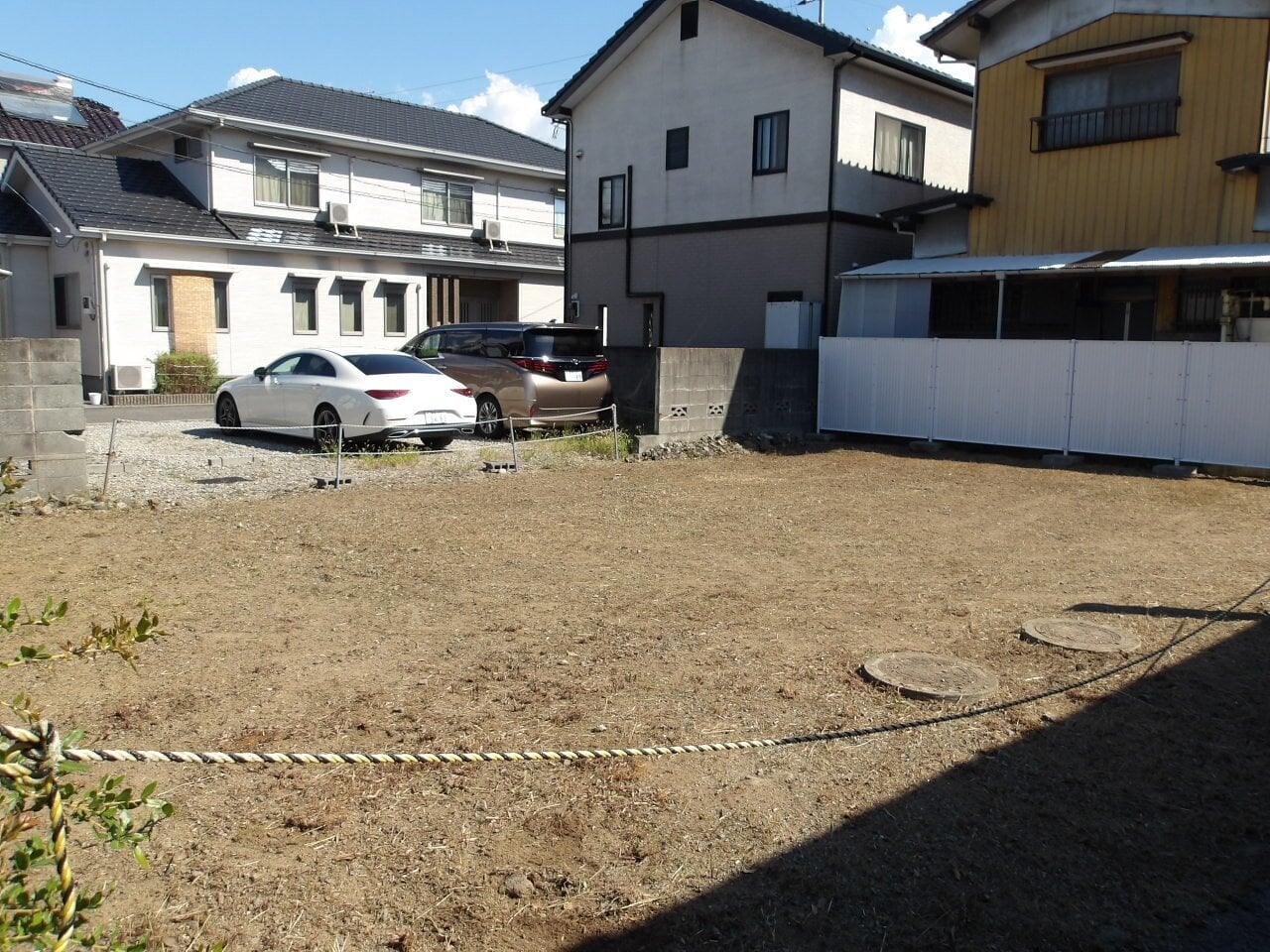 ・物件の敷地内にフェンス、堀、柵、杭、よう壁、給排水施設、舗装、車止めなどの工作物及び樹木等がある場合、これらの改修・撤去費用などについては、市は負担いたしません。(南側隣接地との境界にフェンスあり)