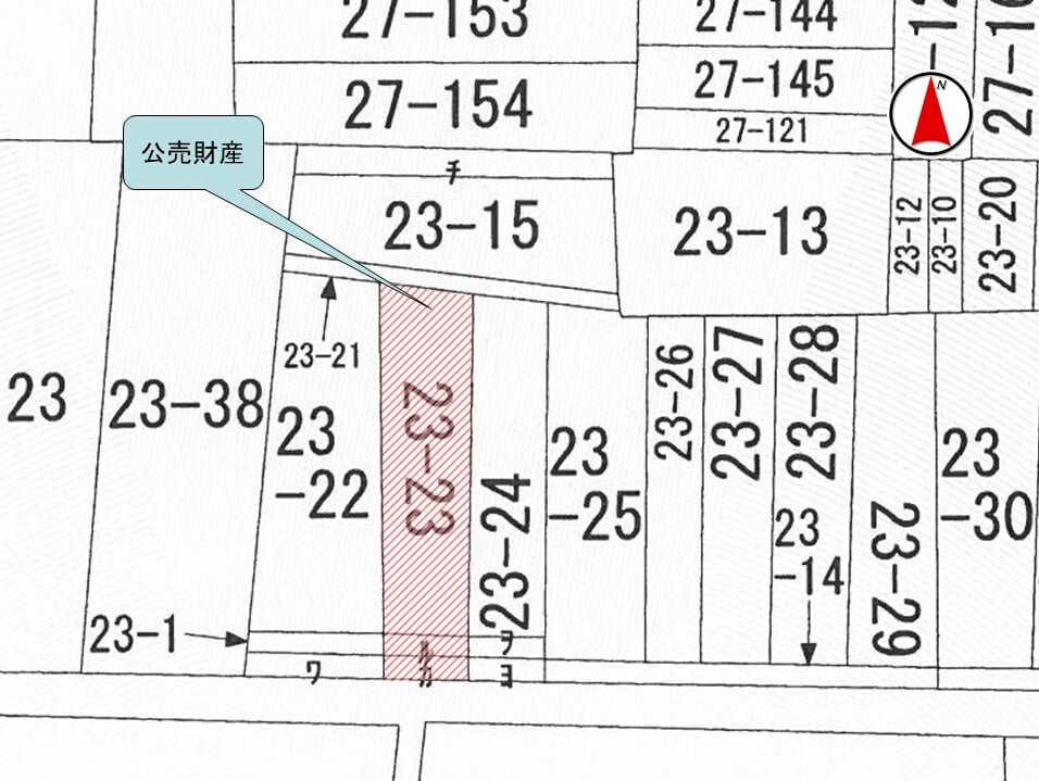 公売財産1〜3は3筆一体で、間口約4.2メートル、奥行き約15.5メートルのほぼ長方形状の画地であり、地勢はほぼ平たんである。