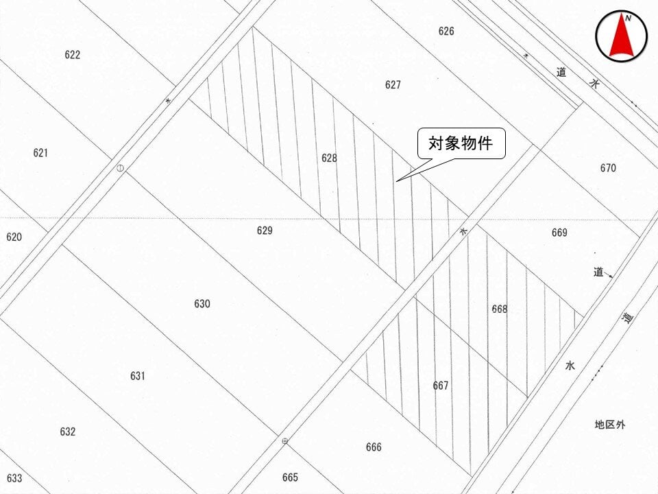 4. 対象物件1と対象物件3の間に幅約2.0メートルの水路が介在しています。