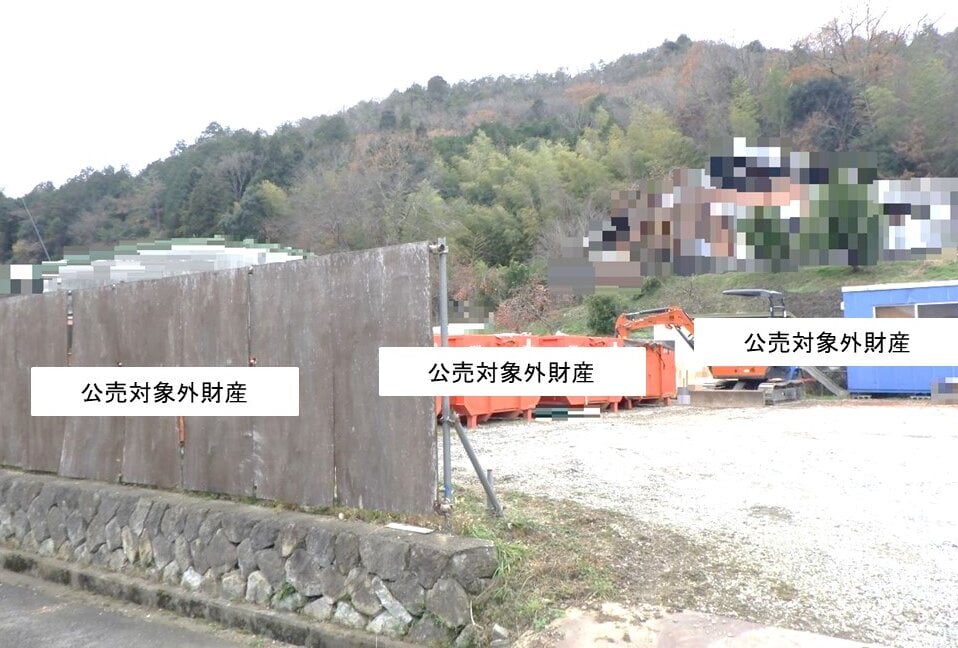 公売財産1には、令和7年12月現在、簡易建物、物置、油圧ショベル及びアームロールコンテナ等の動産が存在する。