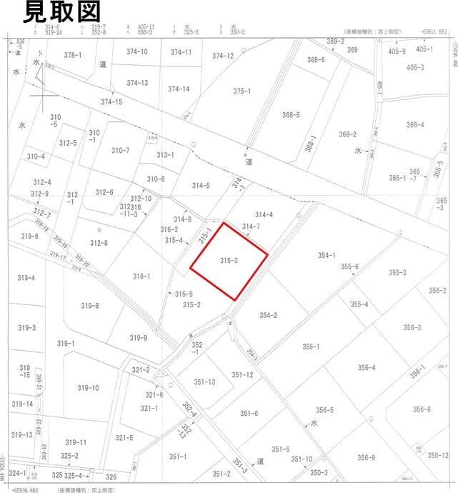 水道管は北西側隣接地 (315番1) を介して引き込まれている。