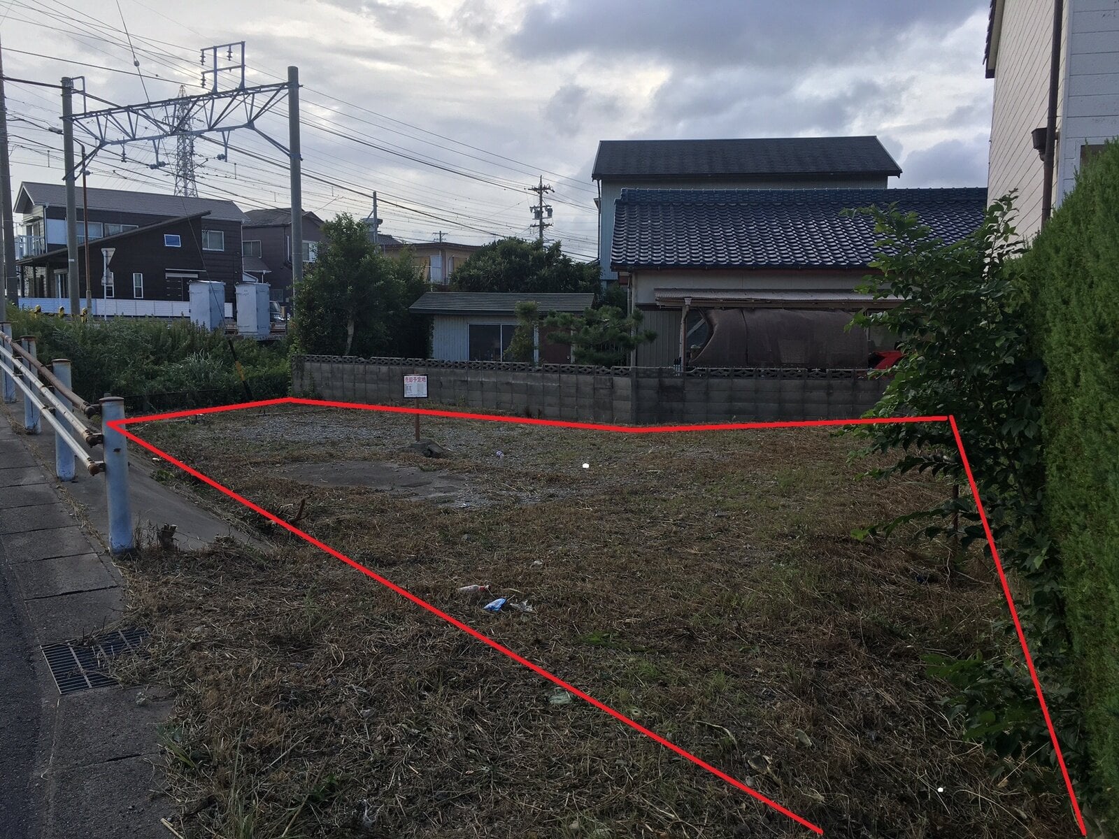 不整形・道路より低い・埋設物あり・支線あり・水道及び下水道未整備・西側鉄道隣接