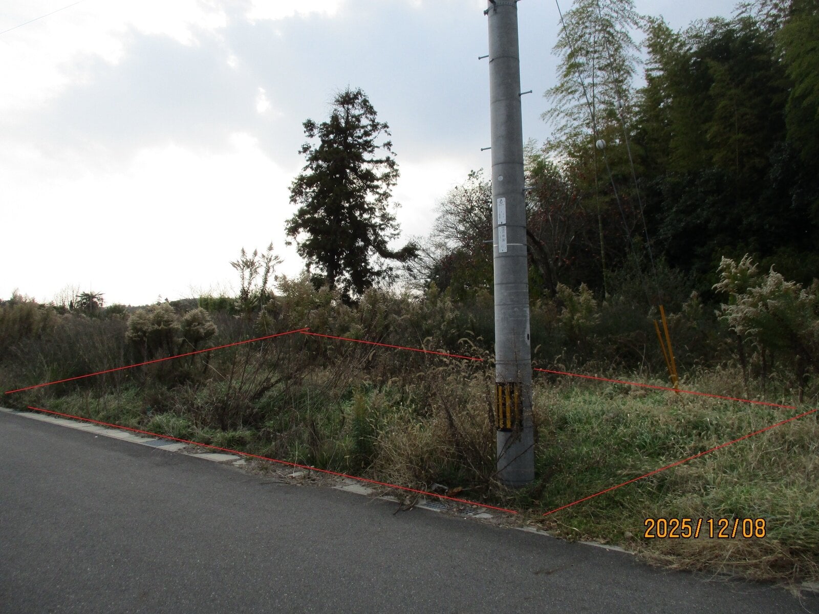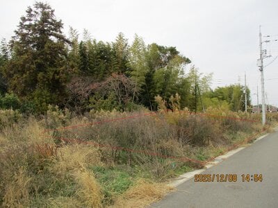 国道190号から約200m北側に入った丘陵地にある数年前に造成されたと思われる団地内の土地である。都市計画法第29条の開発行為の許可を受けた団地ではない。接面道路は「建築基準法上の道路」に指定されていない私道であり現状では建築確認を取得することができない。宅地内には草が生い茂っており、地表面の確認は困難である。また、公道に至るには接面私道の他私有地を通行する必要がある。なお、団地への取付道路は道路法の適用を受けない道路である。