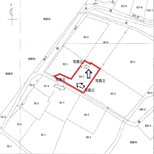 隣地 (92番1の土地) との境界付近で約2メートルの接道があります。