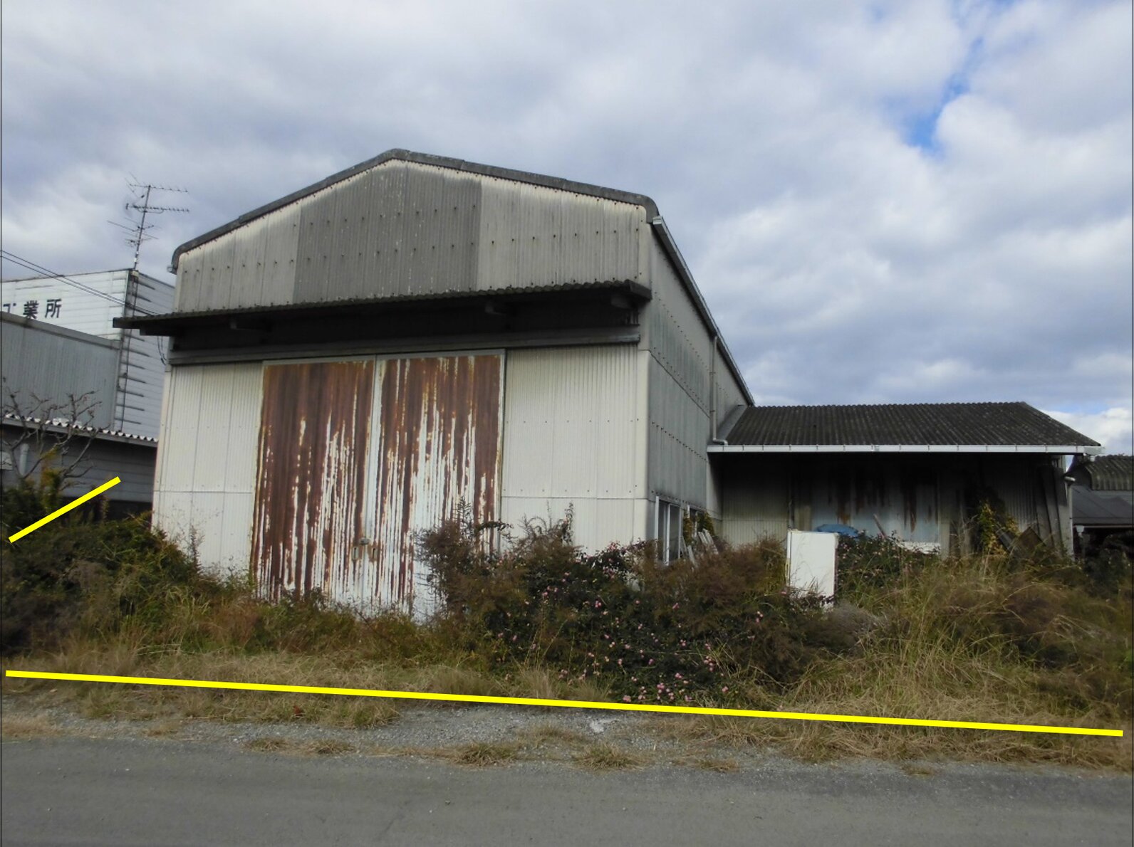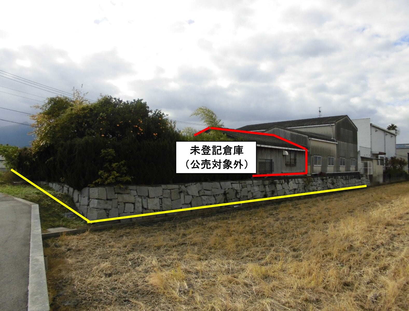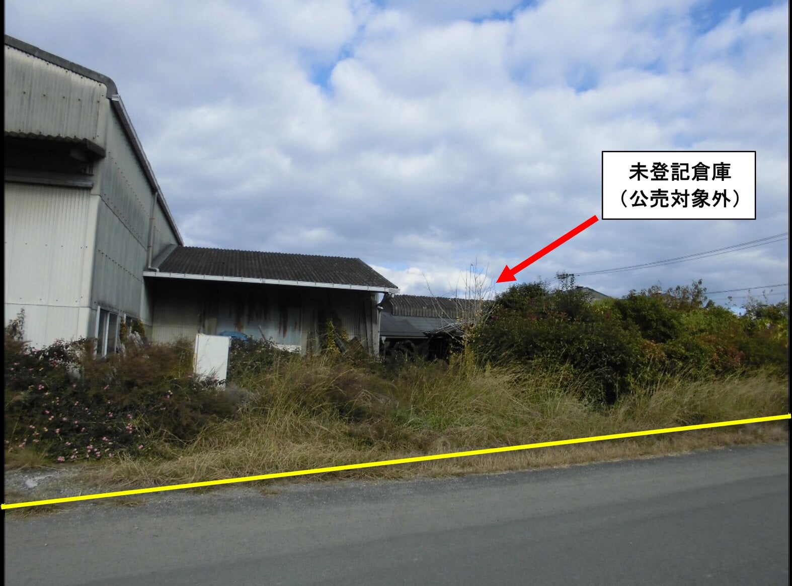 ・未登記建物があります (公売対象外)。所有者への聴取では、主に倉庫の補助使用 (簡易物置、事務所、トイレ) として使用。