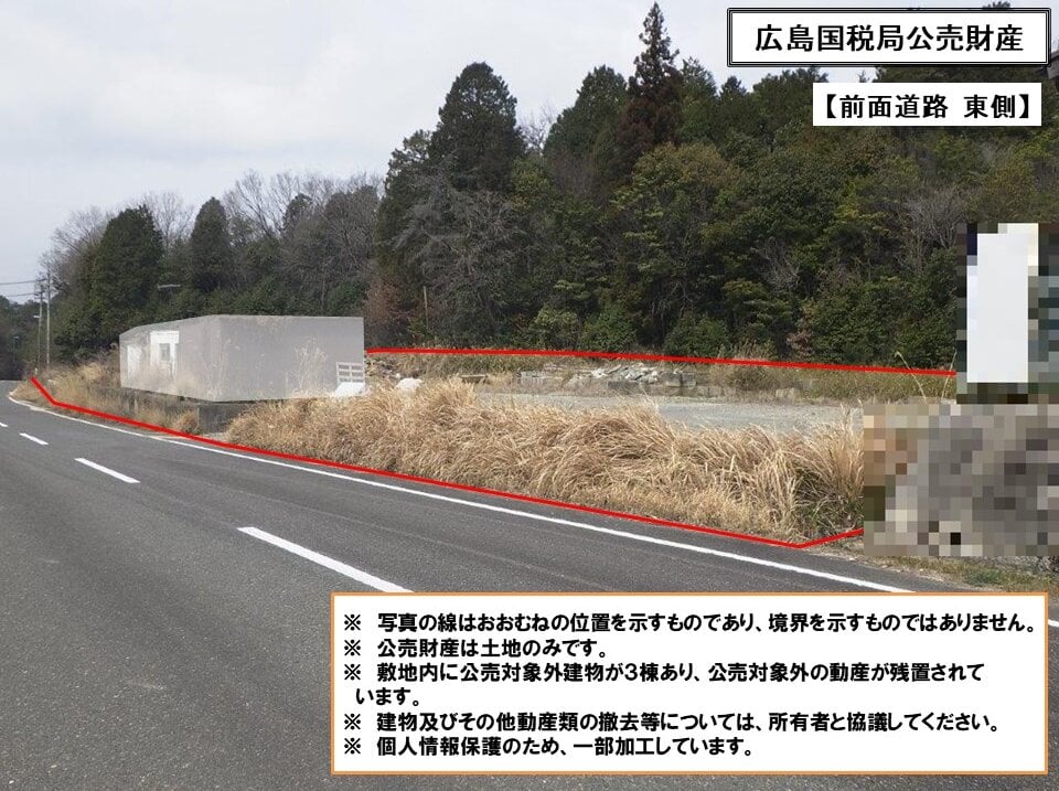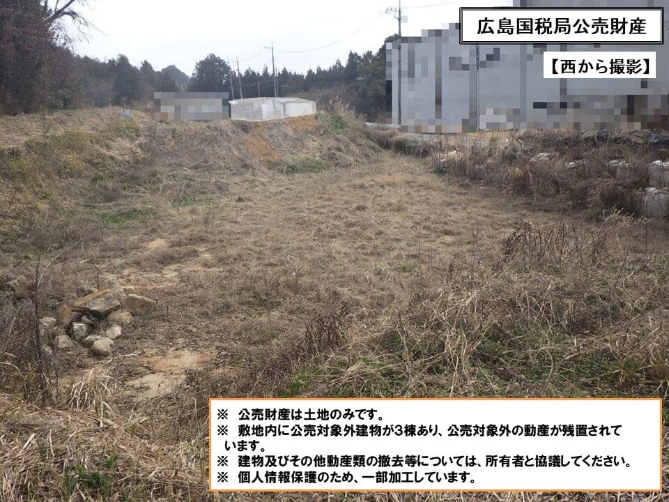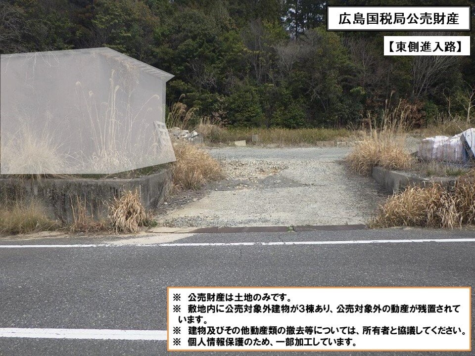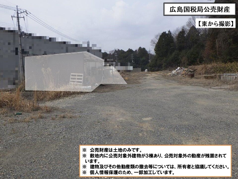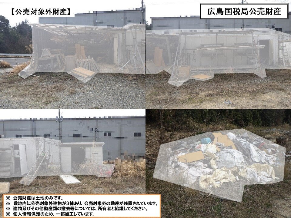 公売財産上に公売対象外の建築物が3棟 (プレハブ小屋、簡易倉庫) あり、建築物内外に公売対象外の動産類が残置されています。
